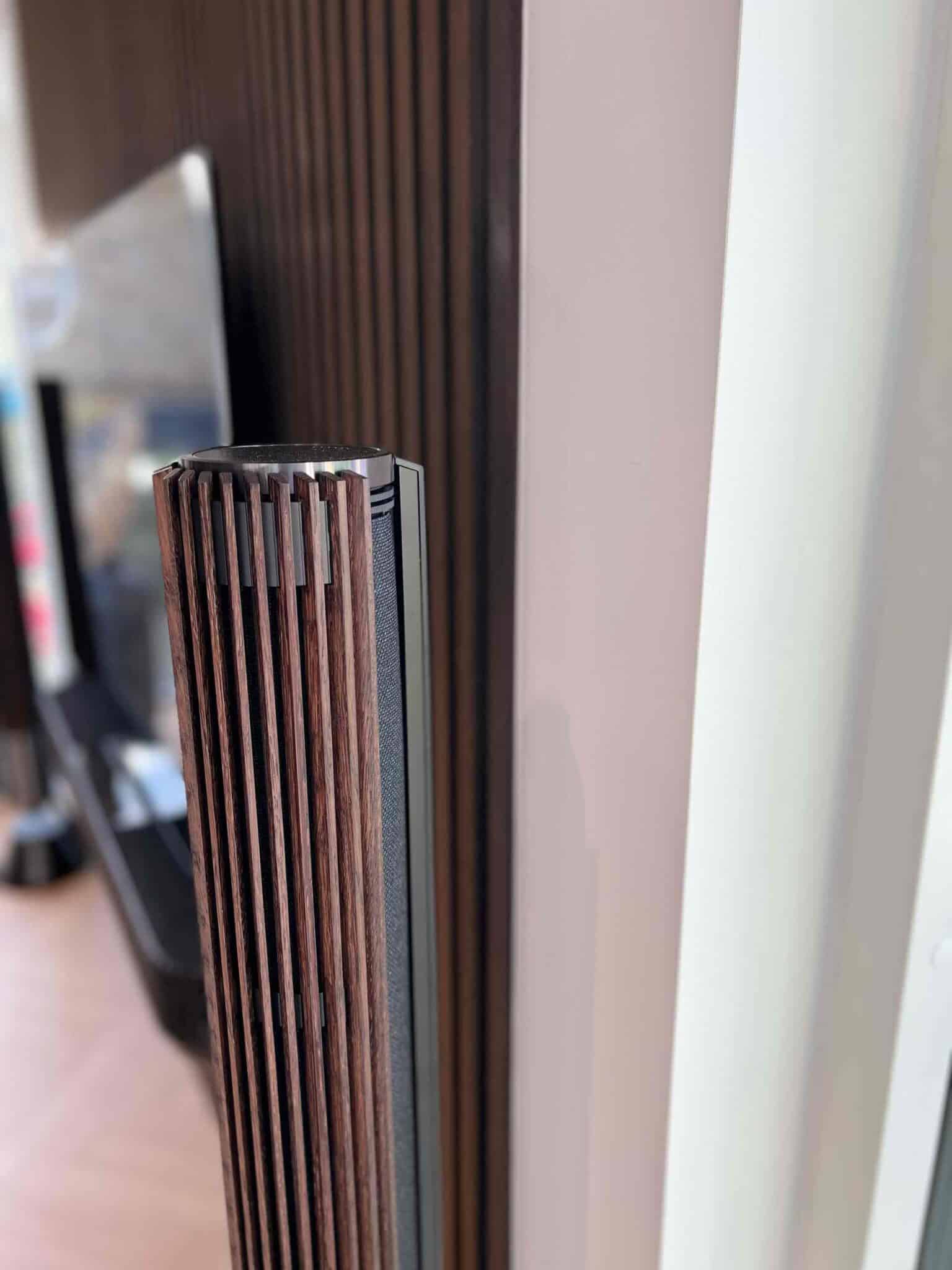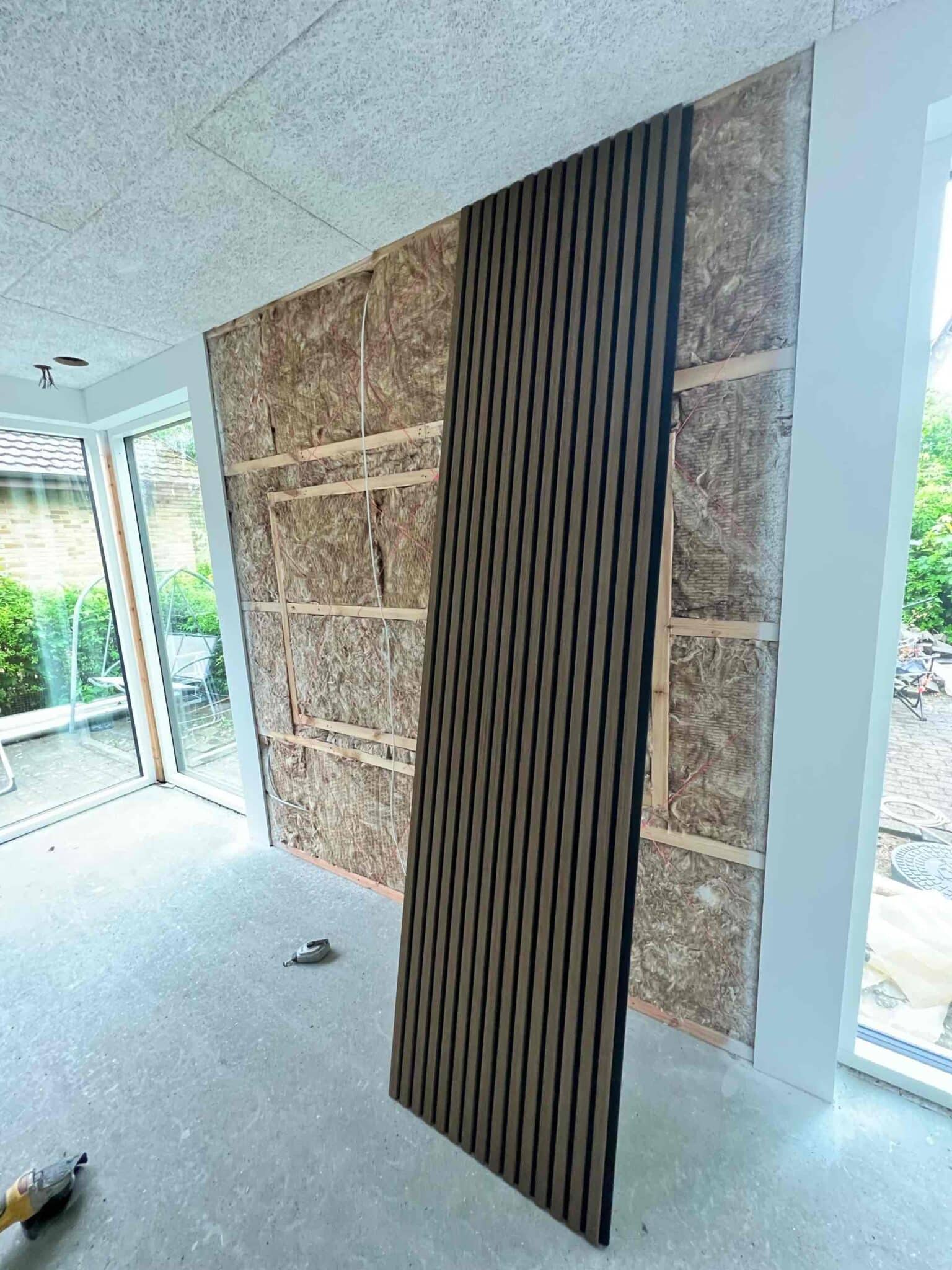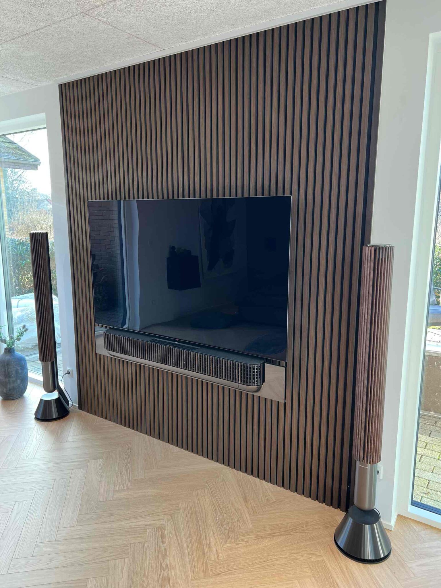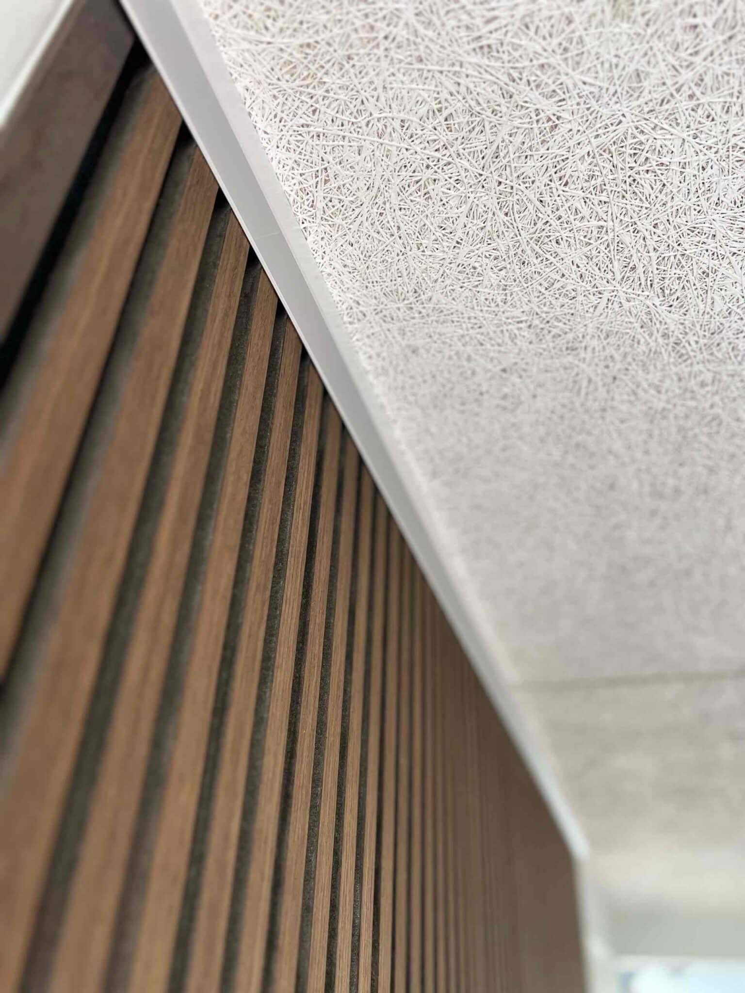 Her har vi monteret akustik paneler i en stue. Der er monteret en kant liste i begge sider. Der er også blevet monteret en hvid LED skinne til Philips Hue